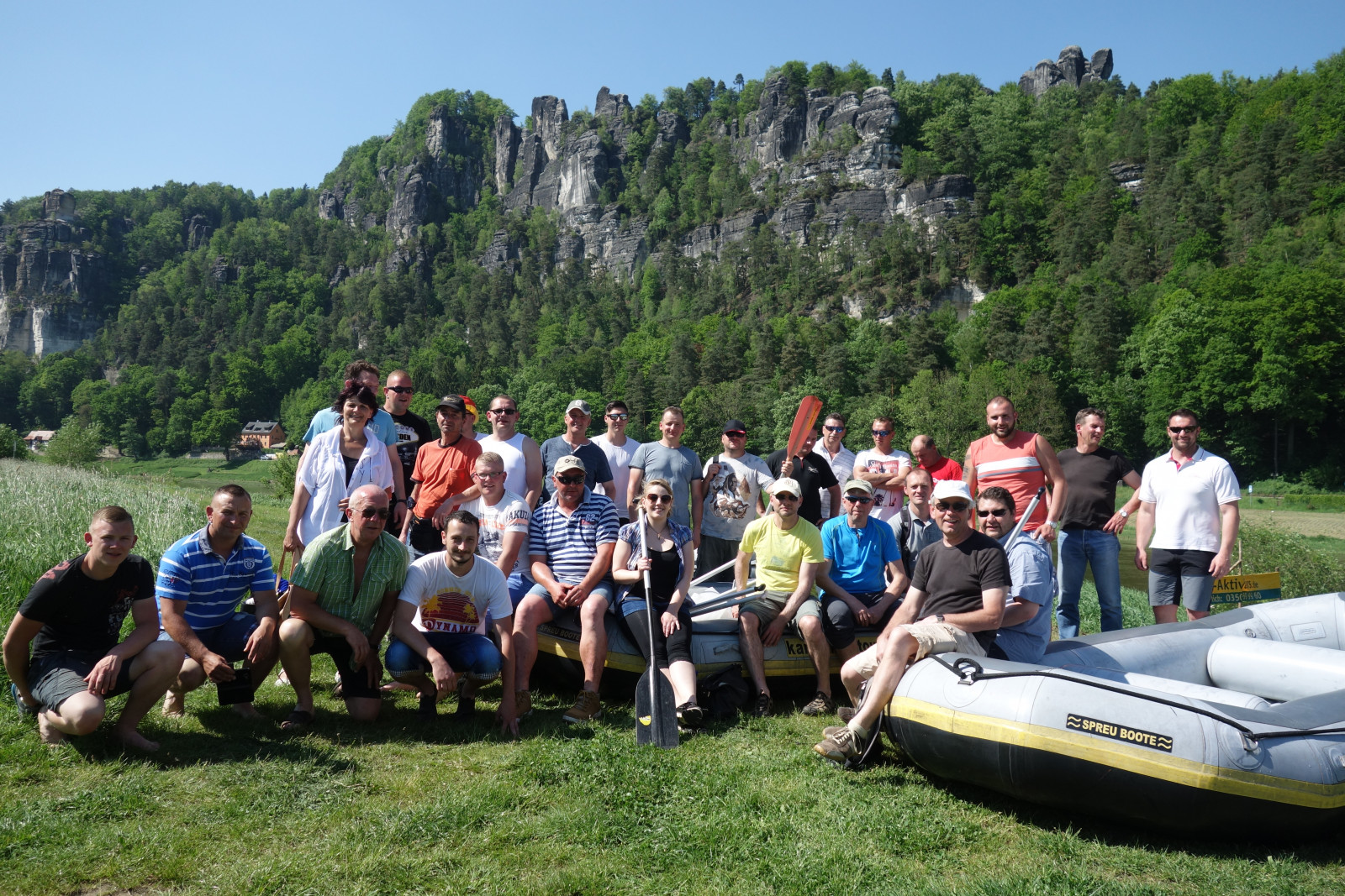 Zu unserem diesjährigen Betriebsausflug ging es aufs Wasser. Bei bestem Wetter sind wir mit vier Schlauchbooten auf der Elbe gepaddelt. Die Strecke führte uns von Bad Schandau nach Rathen.