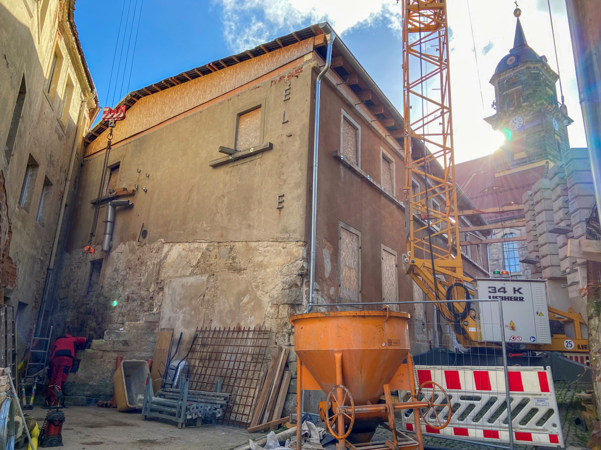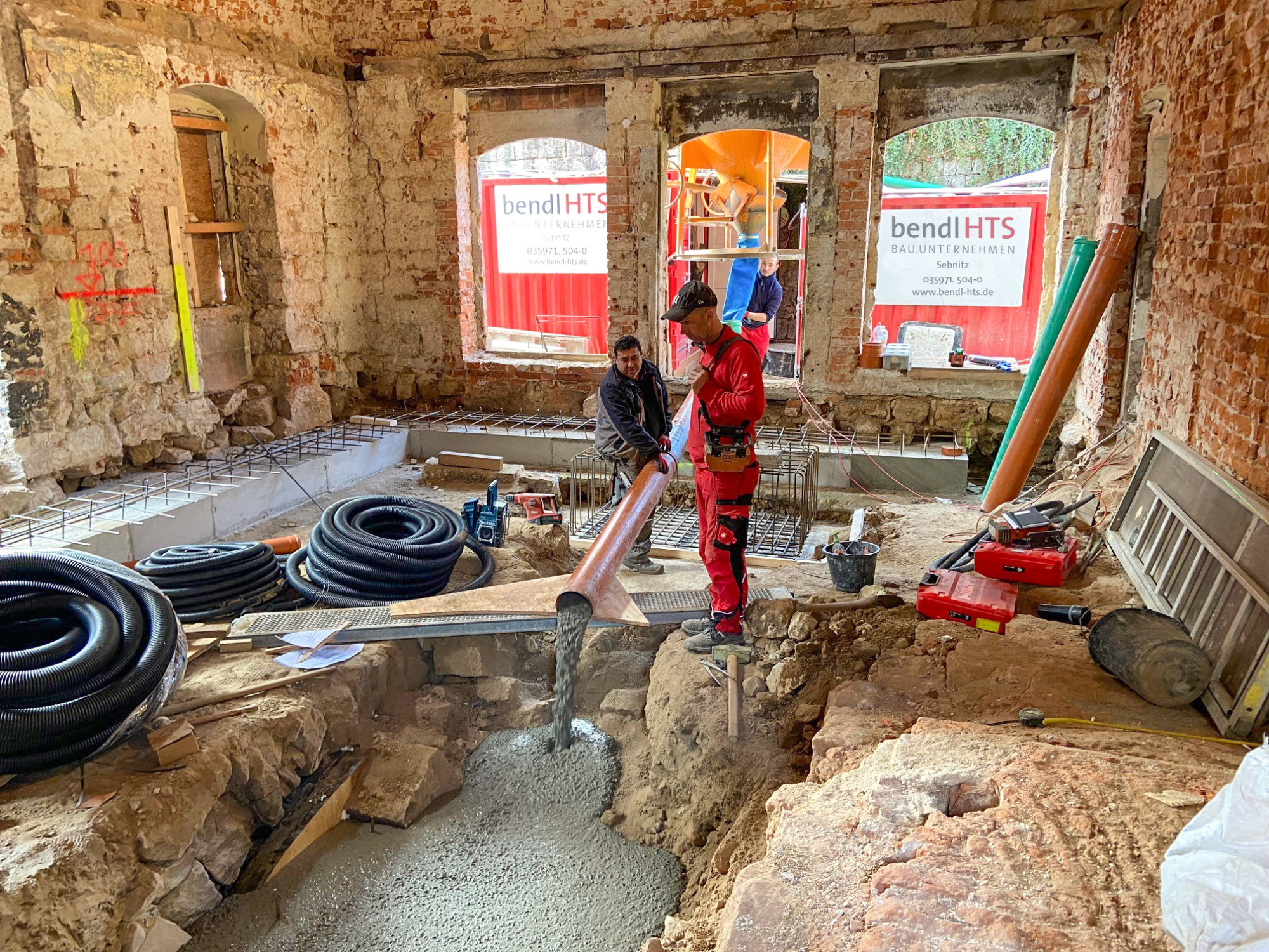 Während unserer Umbau- und Sanierungsarbeiten werden wir die Gewölbedecke mittels einer Bewehrung und Spritzbeton statisch ertüchtigen. Bei der Bewehrung werden Betonbauteile mit Stahl verstärkt, um die Tragfähigkeit und Belastbarkeit der Bauteile zu erhöhen. Im Hauptgebäude werden zudem nicht tragfähige Außenwände abgebrochen und neue Stahlbetondecken sowie ein neues Mauerwerk aus Planziegeln verbaut.