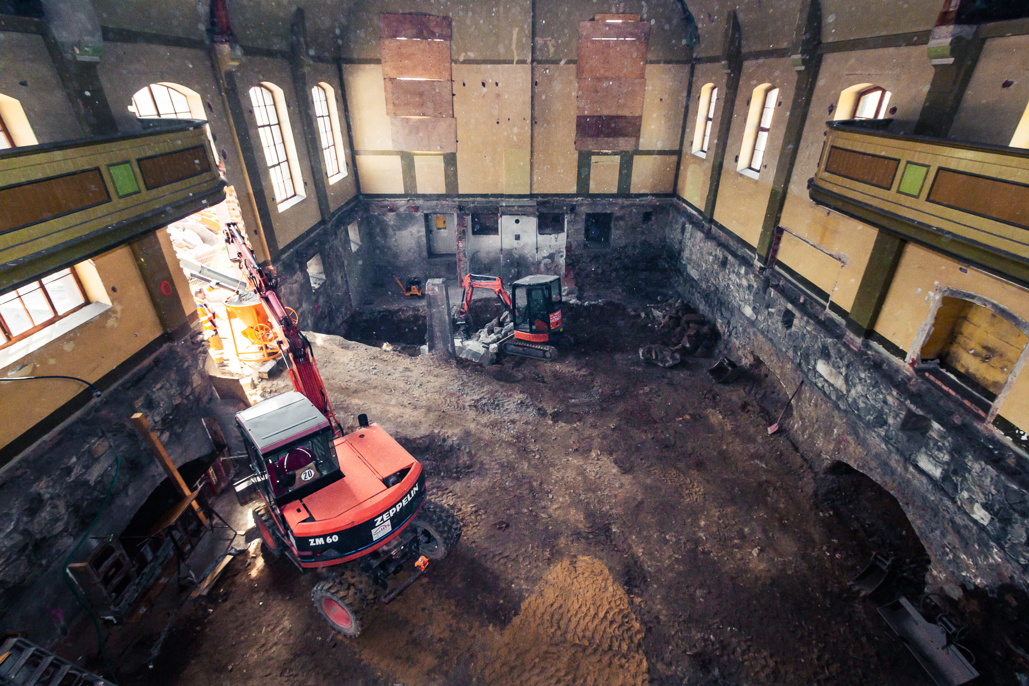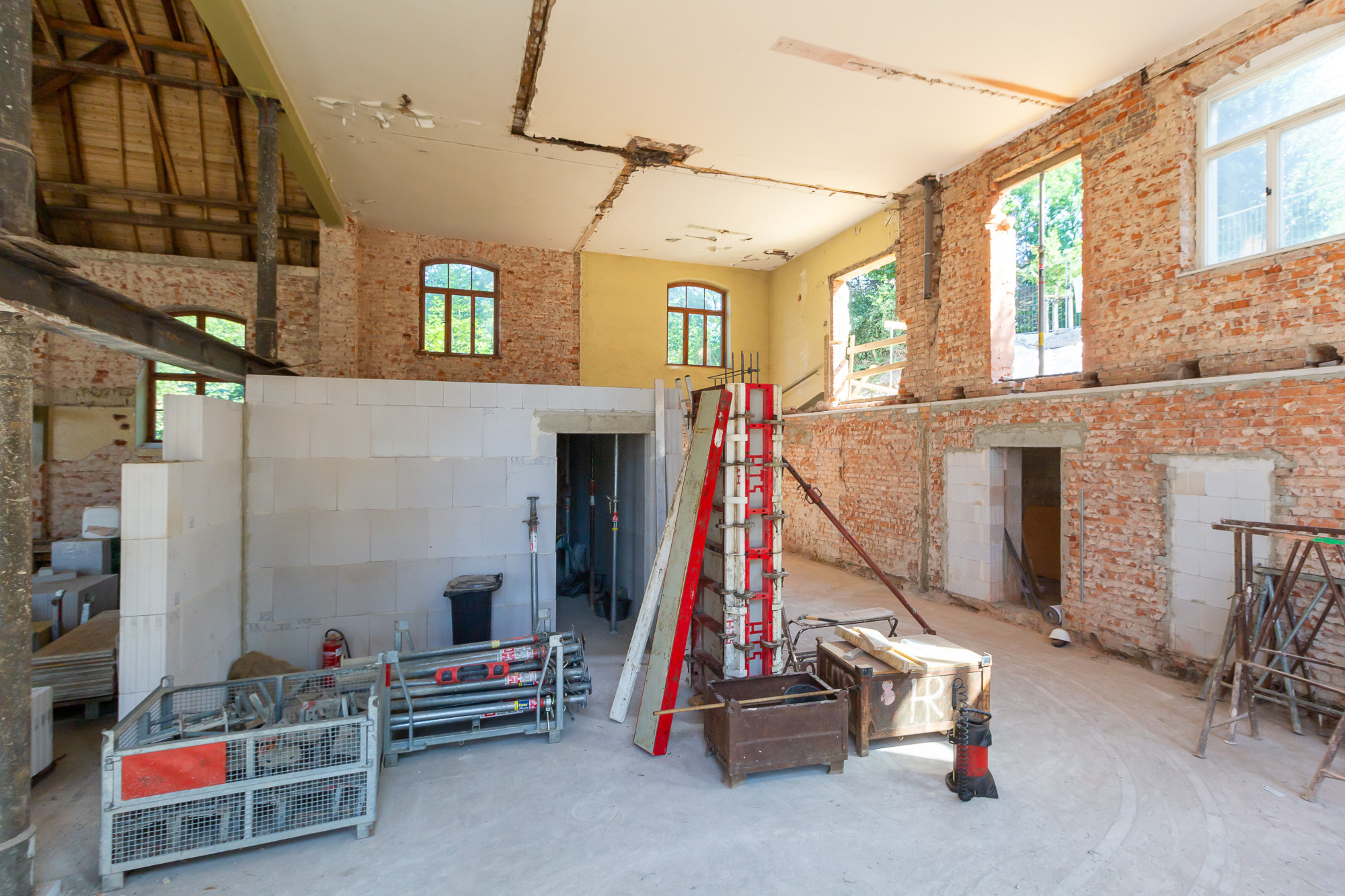Bei der Sanierung des Bestandsgebäudes stellte das Team von Polier Rai Hempel sein Können unter Beweis. Fünf Meter hohe Ziegeldecken und runde Betonsäulen wurden erneuert während auf 2 Etagen insgesamt 101 Steigungen und Zwischenpodeste saniert wurden.