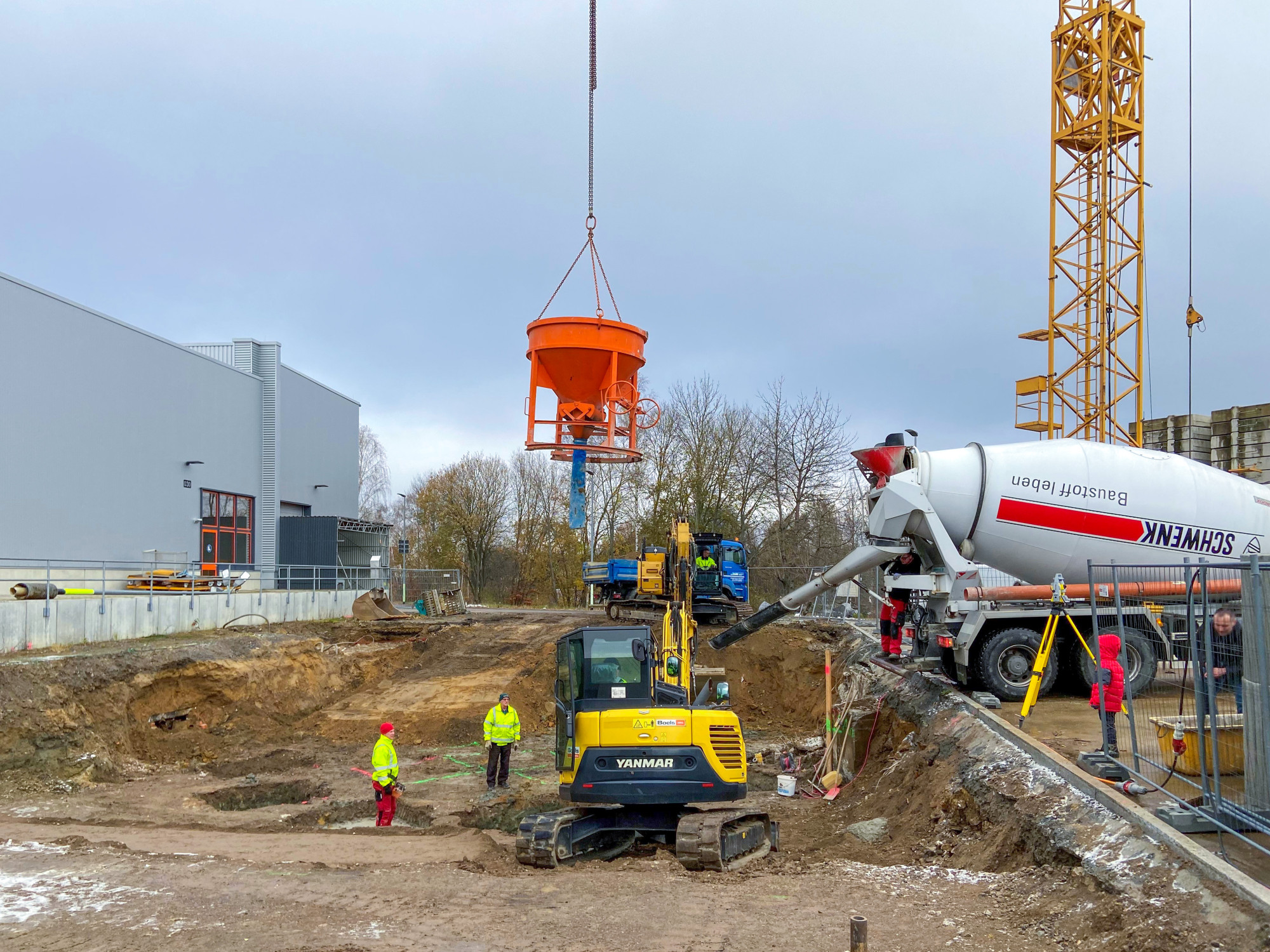 Nach erfolgreichem Abschluss der Tiefbauarbeiten konnten die Teams der Poliere Sven Hanke und Christoph Glaser mit den Rohbauarbeiten für die Verbrennungsanlage beginnen. Drei polygonale Bodenplatten mit jeweils 30, 40 und 50 Zentimeter Stärke sowie einer Gesamtfläche von jeweils 100 m² wurden in kürzester Zeit von uns gegossen. Nach vollendeter Arbeit wird nun mit den Bauarbeiten für die beiden Kesselhäuser sowie der Hackschnitzelanlage begonnen. Anschließend errichten wir an einem der Silogebäude ein Eingangsportal aus Ortbeton mit einer Gesamthöhe von über fünf Meter.