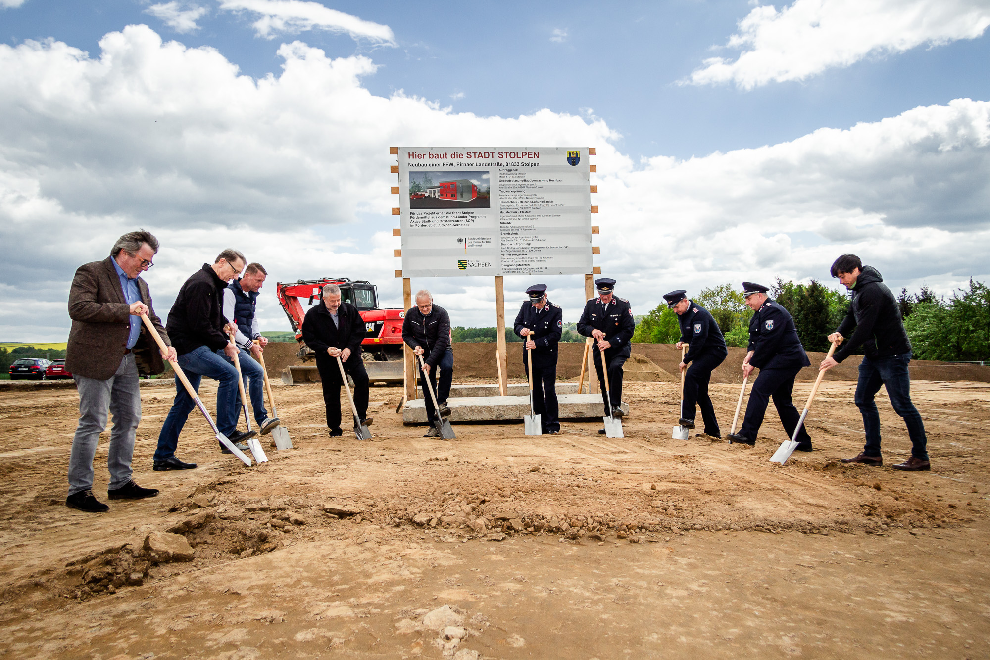 Für die Stadt Stolpen erbauten wir im Jahr 2020 den Rohbau für ein neues Feuerwehrgebäude. Zum Spatenstich am 12. Mai 2020 waren sowohl der Bürgermeister Uwe Steglich als auch mehrere Feuerwehrmänner der Stadt Stolpen anwesend. Der Bürgermeister begrüßte es, dass wir als regionales Bauunternehmen diesen Auftrag ausführen, und freut sich auf das Ergebnis.