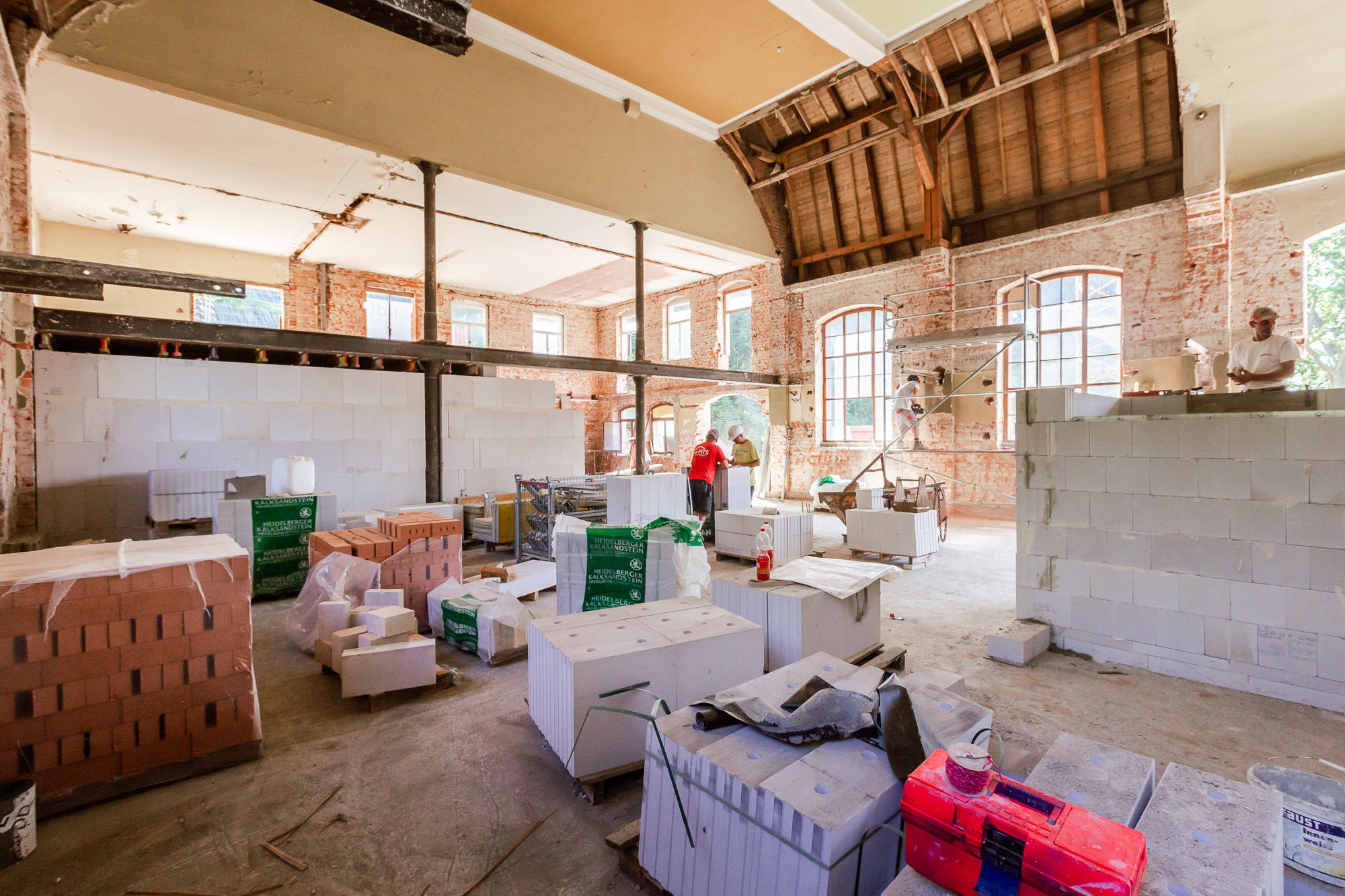 Bei der Sanierung des Bestandsgebäudes stellte das Team von Polier Rai Hempel sein Können unter Beweis. Fünf Meter hohe Ziegeldecken und runde Betonsäulen wurden erneuert während auf 2 Etagen insgesamt 101 Steigungen und Zwischenpodeste saniert wurden.